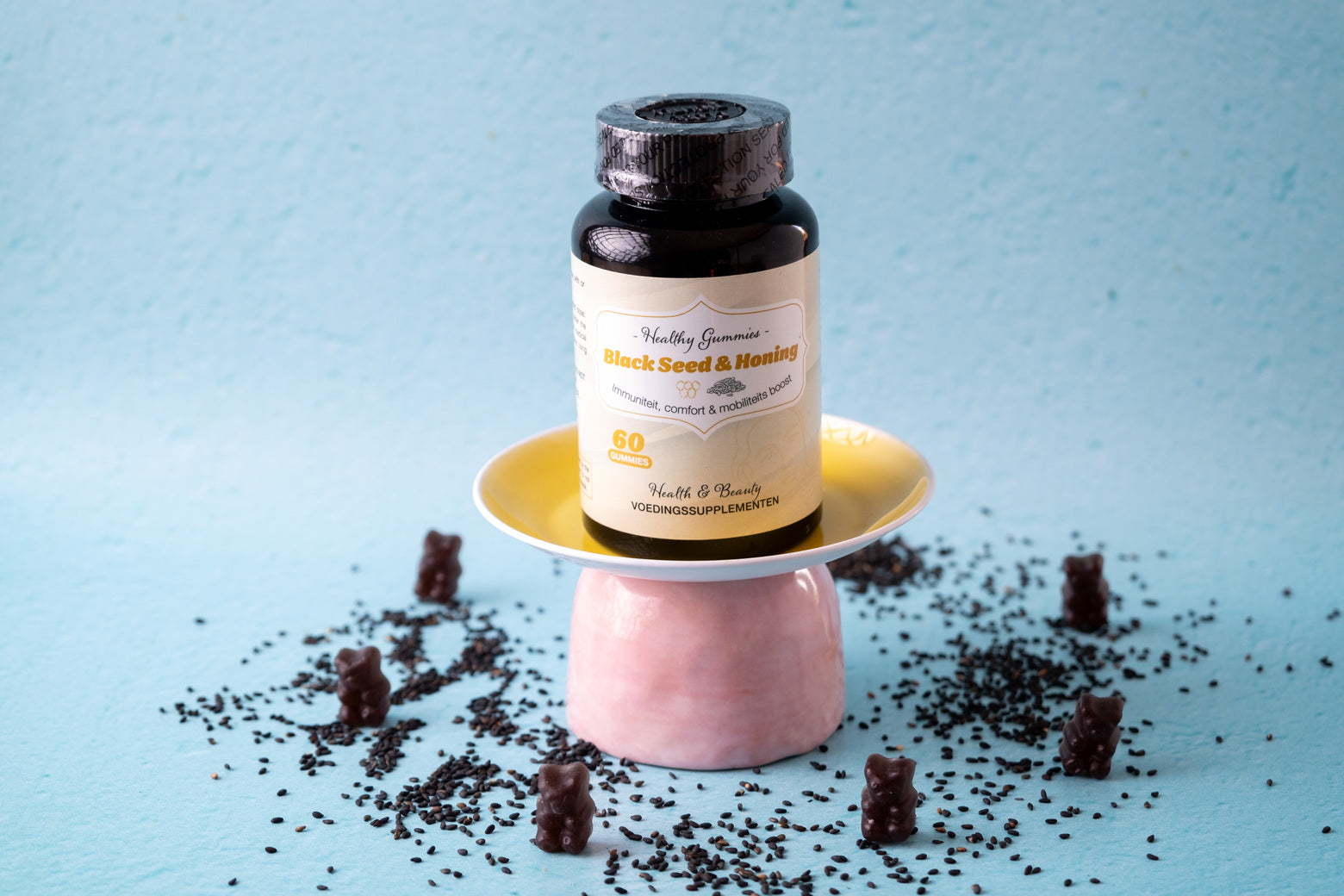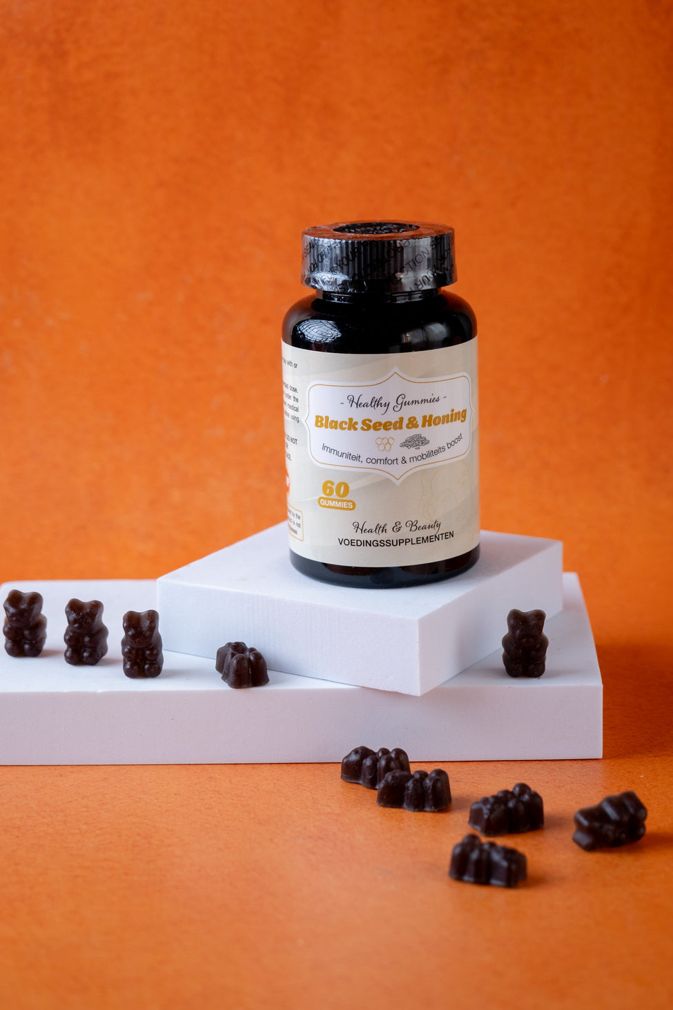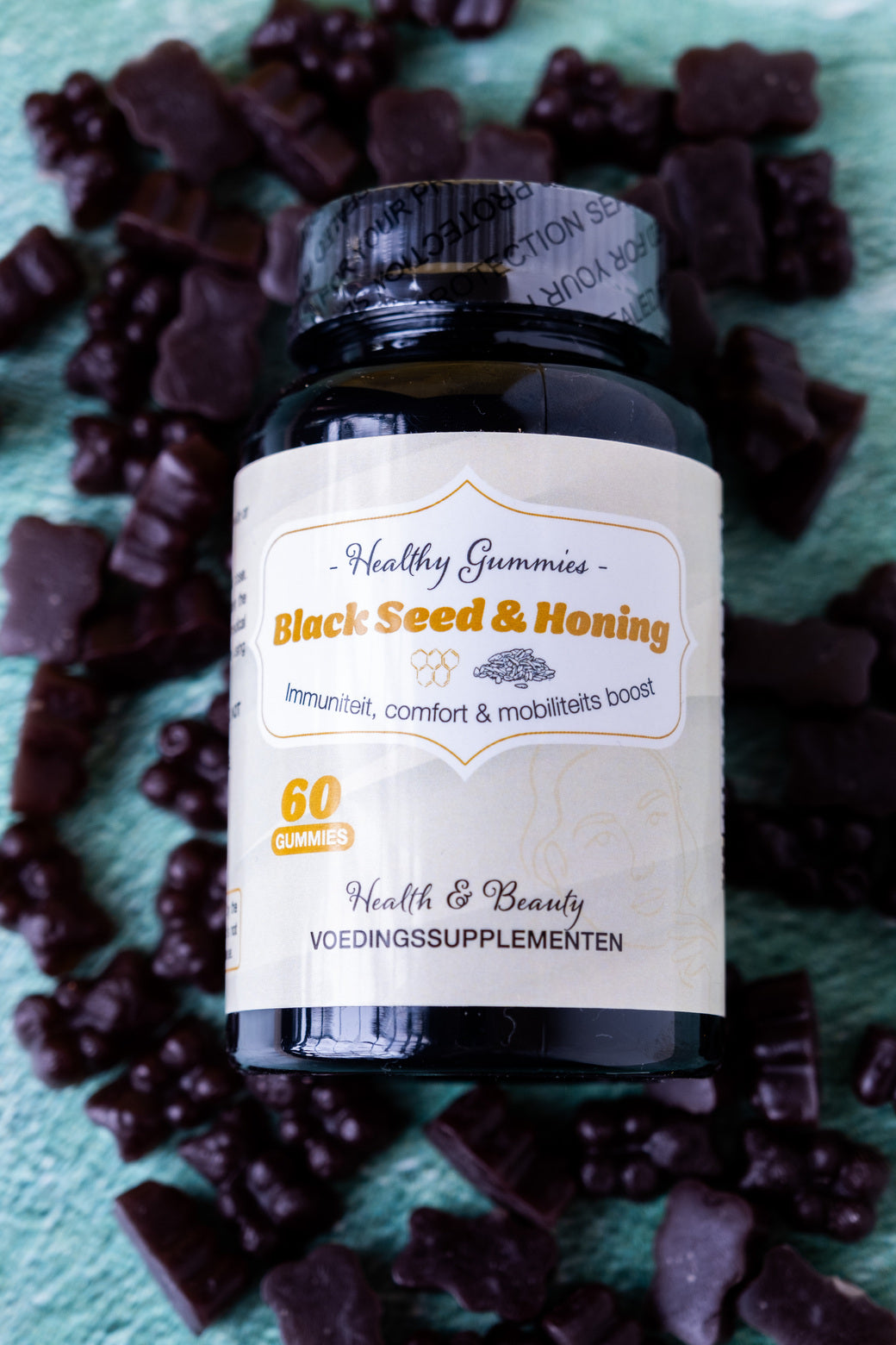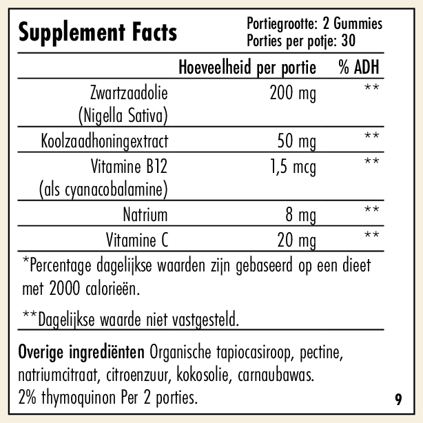 Ontdek de unieke combinatie van Black Seed en Honing in onze heerlijke gummies. Deze krachtige mix biedt een natuurlijke bron van antioxidanten, vitaminen en mineralen om je algehele gezondheid te ondersteunen. Of je nu je immuunsysteem wilt versterken, je spijsvertering wilt verbeteren of gewoon van een gezond tussendoortje wilt genieten, onze Black Seed & Honing Gummies zijn de perfecte keuze.