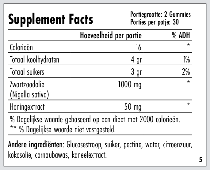 - Zwarte komijnzaadolie (Nigella Sativa): Elk gummy bevat pure olie vol met essentiële vetzuren en antioxidanten.